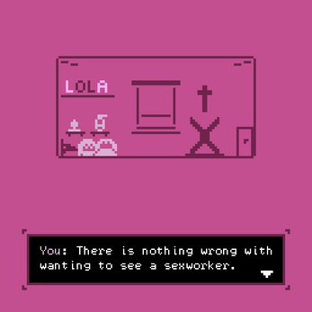 This tiny bitsy game / visual novel tells the story of an experienced queer female sexworker and her last client. Though marked as NSFW, this game is not showing sexual scenes. Instead, it approaches the struggles of queer self discovery, anxiety and confrontation with internalized fears as a result of queerphobic environments.